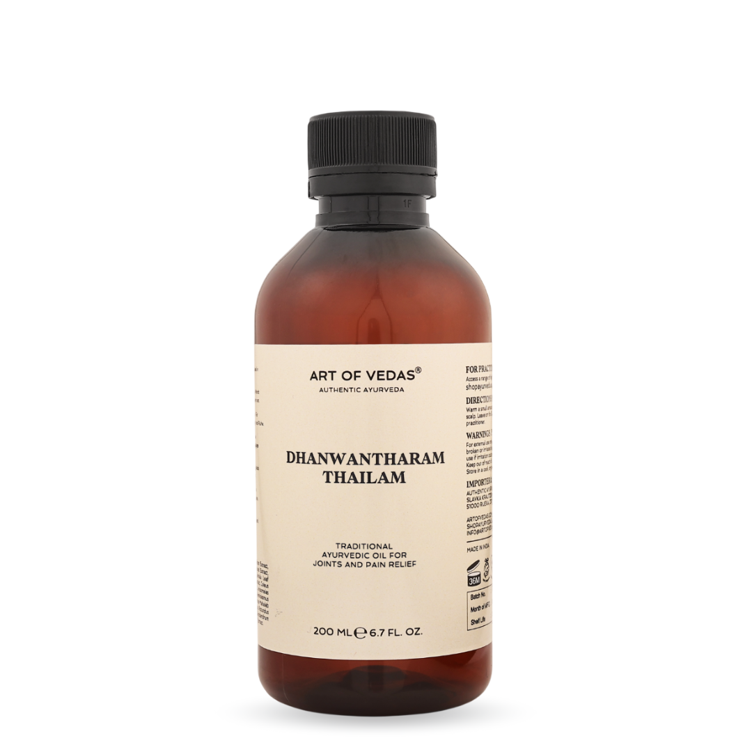 Dhanwantharam Thailam is een van de meest eerbiedwaardige formules uit de Ayurveda, beschreven in zowel de Ashtanga Hridayam als de Sahasrayogam. De bereiding combineert meer dan 30 kruiden – waaronder Bala (Sida cordifolia), Ashwagandha, de tien wortels van Dashamoola, Devadaru en Shatavari – slow-cooked in sesamolie met verwerking van melk via de traditionele Ksheerapaka-methode.