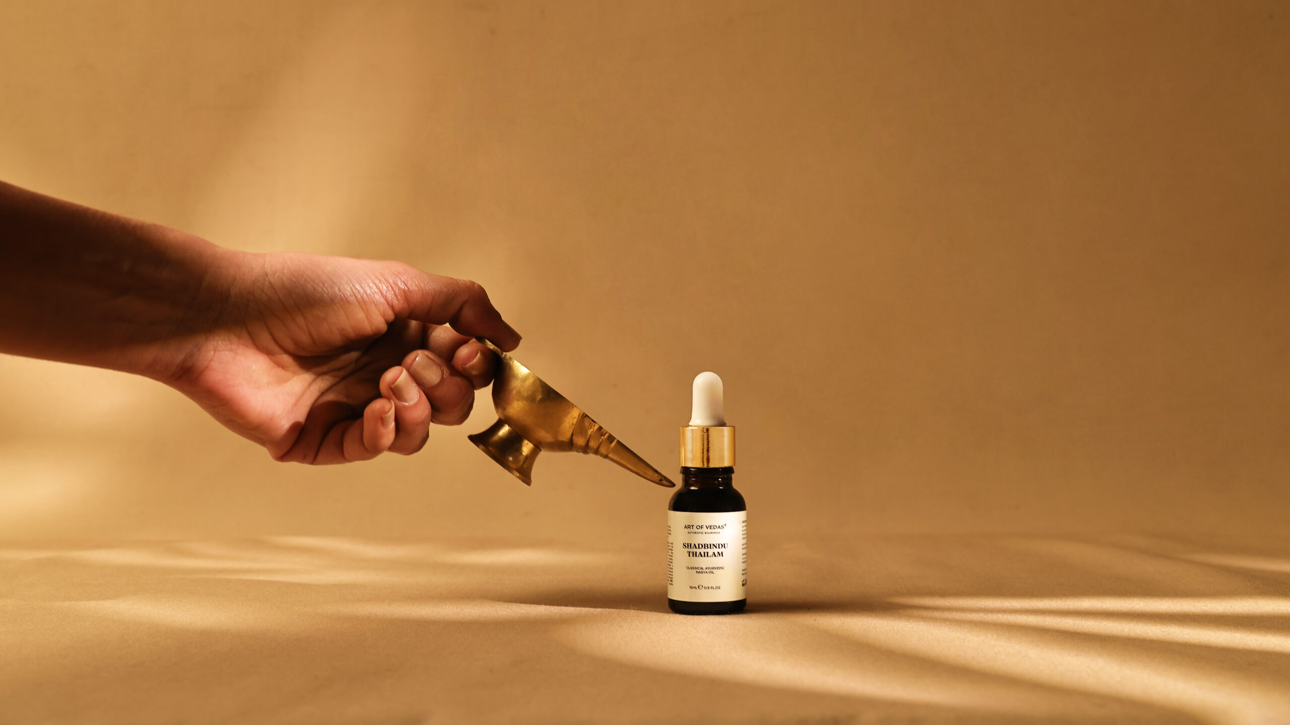 Shadbindu Thailam is een klassieke Ayurvedische neusdruppelformule. In tegenstelling tot de fijne, dagelijkse Anu Thailam (voor routine Nasya) is Shadbindu Thailam een krachtigere olie die traditioneel wordt ingezet bij sinus-gerelateerde klachten, hoofdzwaarte en congestie. De naam verwijst naar de zes (shad) bijzondere kruidenbestanddelen van de formule.